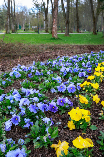 Obraz premium Flower bed with pansy flowers in city park.