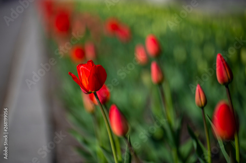 Obraz premium Flower bed with red tulips