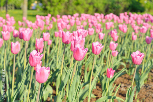 © konstan, Fototapeta premium Flower beds with pink tulips.