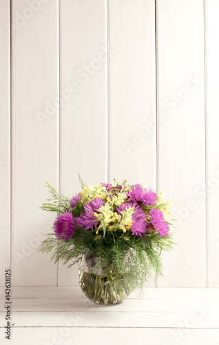 Fototapeta premium Flower bouquet in glass round vase on background of white wooden planks in provence style