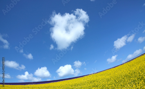 Obraz premium Flower field and blue sky with clouds.