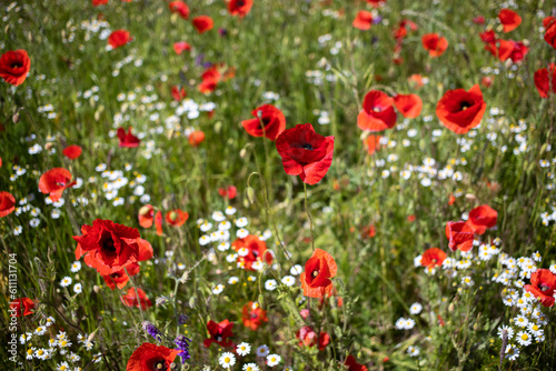 Fototapeta premium Flower field with poppies and daisies in summer june. Blossom