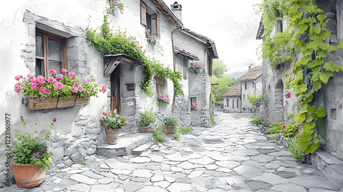 Fototapeta premium Flower-filled stone street, idyllic village, mountain backdrop, postcard