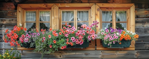 © peppastocker, Fototapeta premium Flower-filled window boxes on a cottage