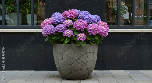 © Selene Studio, Fototapeta premium Flower, Flowers, Purple, Potted Hydrangeas in front of a building