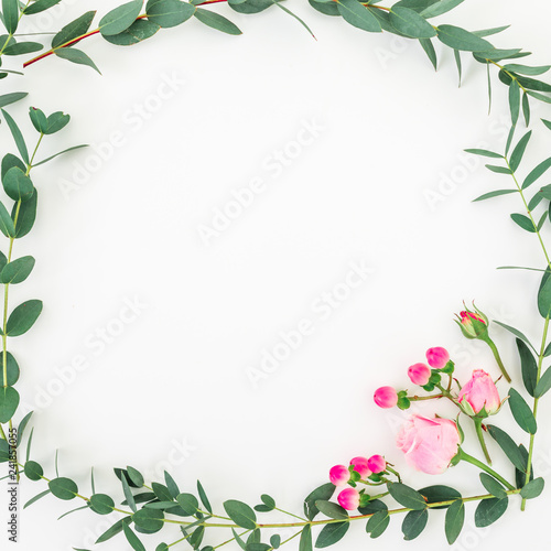 Naklejka premium Flower frame of pink roses and eucalyptus branches on white background. Flat...