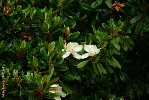 © vahanabrahamyan, Naklejka premium Flower, fruits and foliage of Magnolia grandiflora (Southern magnolia)