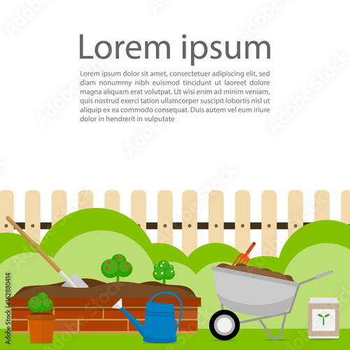 Naklejka premium flower garden bricks, wheelbarrow and watering can tools vector