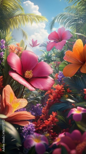 © Food and drink, Naklejka premium Flower garden in stylized 3D style with bold forms, vivid colors, and a dynamic, realistic portrayal of flowers and foliage.