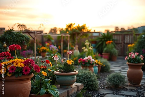 © stockimgahnaf, Fototapeta premium Flower garden with colorful flowers in terracotta pots beautiful floral nursery with copy space