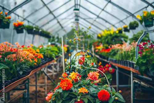 © tatsiana502, Fototapeta premium flower greenhouse with flowering plants for sale, dahlias in pots in rows