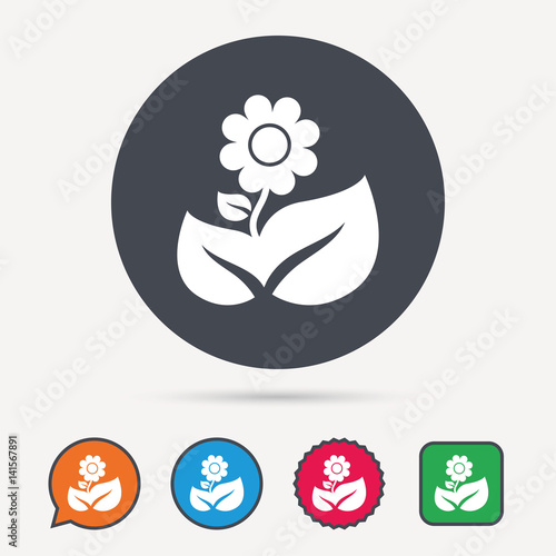© tanyastock, Obraz premium Flower icon. Florist plant with leaf symbol. Circle, speech bubble and star buttons. Flat web icons. Vector