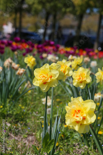 © mair, Fototapeta premium flower, nature, spring, flowers, garden, yellow, plant, orange, summer, field, blossom, flora, bloom, beauty, meadow, narcissus, floral, petal, tulip, daffodils, marigold, daisy, bright, grass, red