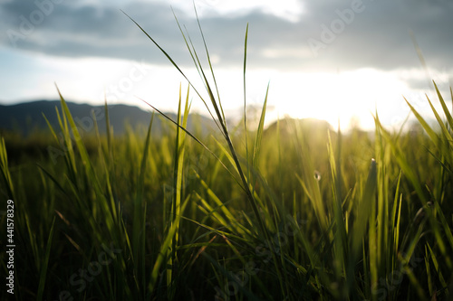 © karanathip, Fototapeta premium Flower On meadow Field Against Sky During Sunset