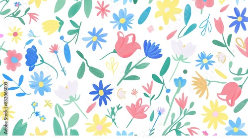 © Thanthara, Obraz premium Flower pattern flat design top view spring cartoon drawing colored pastel