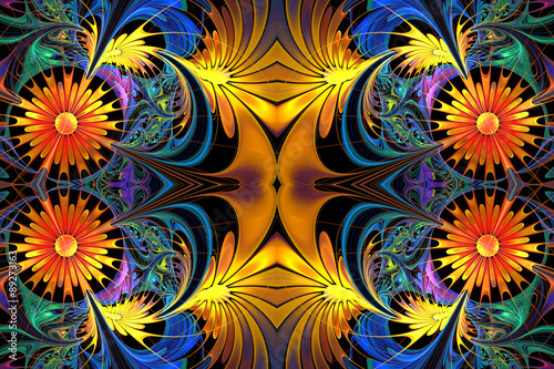 © Velirina, Obraz premium Flower pattern in fractal design. Yellow and blue palette. On bl