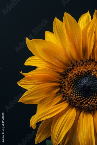 © Eyestetix Studio, Obraz premium flower Photography, Helianthus annuus, copy space on right, Close up view, Isolated on black Background