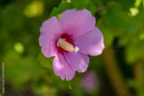 Fototapeta premium Flower pink closeup on green background. Purple blooming plant. Nature garden...