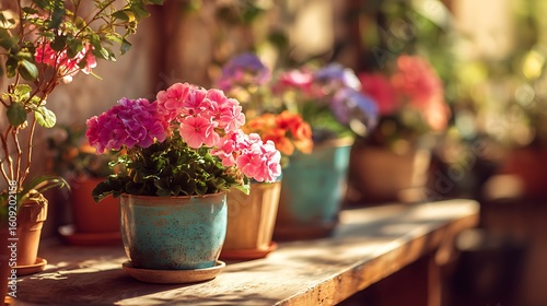 Fototapeta premium Flower pots on table in warm light colorful blooms cozy interior garden...