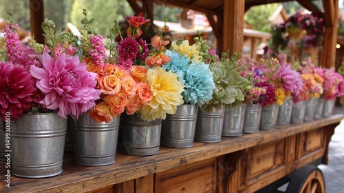 © Oleksandr, Obraz premium Flower Power: A colorful assortment of fresh-cut flowers displayed in a row of galvanized steel buckets adds charm and beauty to this rustic flower cart.
