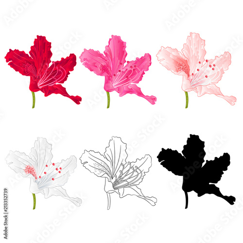 Obraz premium Flower rhododendron mountain shrub red,pink, light pink, white , outline and silhouette on a white background vintage bloom three vector illustration editable hand draw