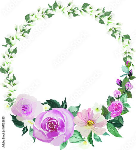 Fototapeta premium Flower roses and green leaves wreath, watercolor painting artwork illustration vector