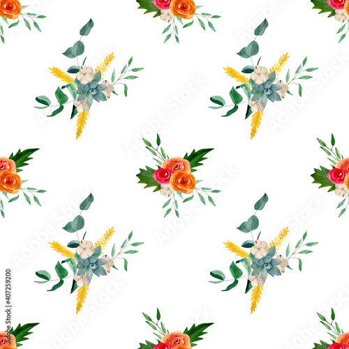 Fototapeta premium Flower seamless pattern with roses, eucalyptus, cotton, succulents and greenery. Backgrounds and wallpapers for invitations, cards, fabric, packaging, textile. Watercolor illustration.