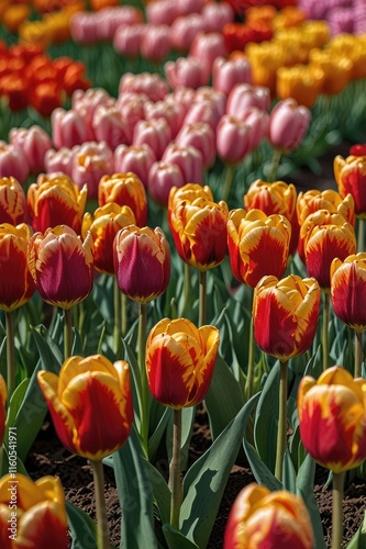 © Halim Karya Art, Fototapeta premium flower wallpaper, Tulips arranged symmetrically in vibrant rows of color