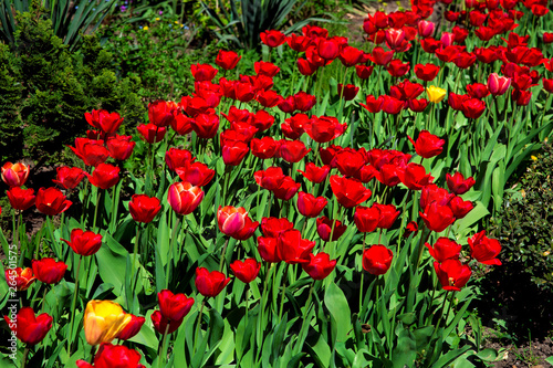 Fototapeta premium Flowerbed with blooming red tulips lit by sunlight.