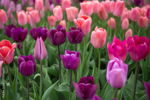 © Space Priest, Fototapeta premium Flowerbed with spring tulips. Backdrop with selective focus and copy space