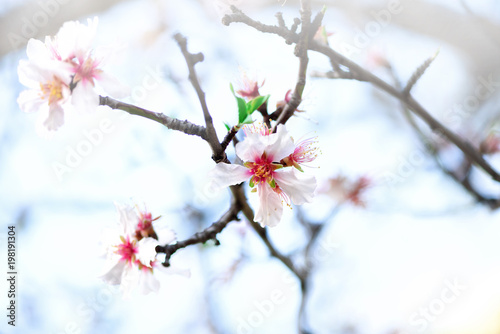 © jchizhe, Obraz premium Flowering almond tree. Blooming almond flower. Blossom spring day. Copy space