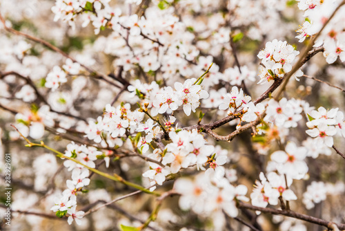 Obraz premium Flowering almond trees during the spring in a Mediterranean city, ideal for a soft background.