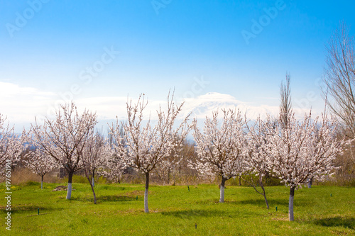 Obraz premium Flowering apricot trees against Ararat, Yerevan, Ararat
