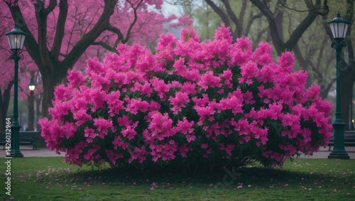 © Seyyar, Fototapeta premium Flowering azalea bush in the public square