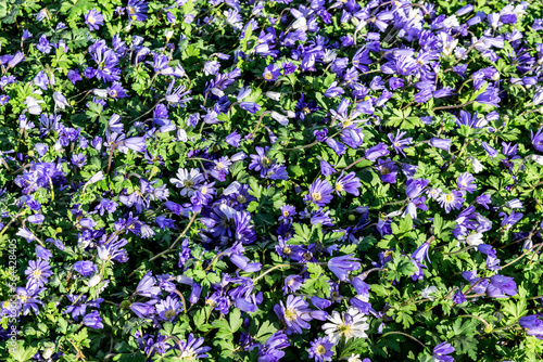 © O de R, Naklejka premium Flowering blue Anemones Blanda in spring forest. Spring small purple flowers in the garden. Floral background with flowers and green leaves.