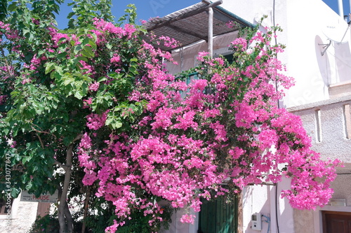 Fototapeta premium Flowering Bougainvillea, a southern beautiful plant on the streets of the village of Myrtos, Crete. Greece