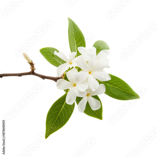 © olegganko, Fototapeta premium Flowering Branch Brings Bright Blooms and Green Leaves to a Simple Setting