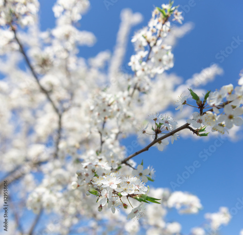 © sergo321, Obraz premium Flowering branch of fruit tree. Cherry blossomed in the spring.