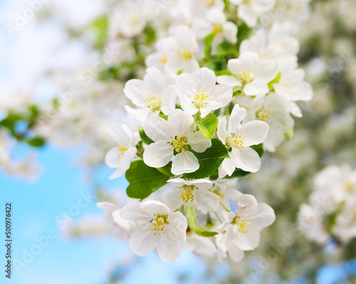 Fototapeta premium flowering branch on a tree against the blue sky