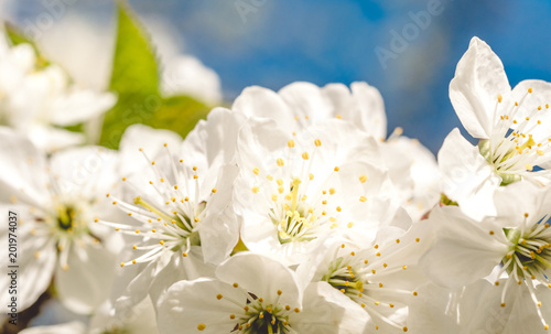 © Maryna Konoplytska, Obraz premium Flowering cherry and blue sky. Spring holiday card