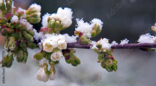 © Swetlana Wall, Obraz premium Flowering cherry covered with white snow. Spring background.