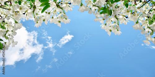 © 151115, Fototapeta premium Flowering cherry, sky with clouds. Spring background. Panorama.