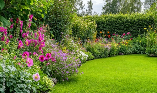 © Tanya, Fototapeta premium Flowering common hollyhock Alcea rosea plants with colorful flowers in summer garden panoramic