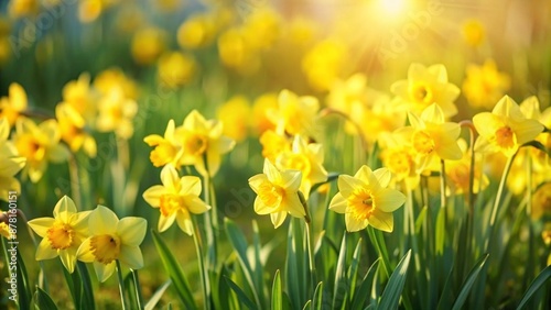 Fototapeta premium flowering daffodils in springtime, a lot of yellow narcissus blossoms in a spring garden, flower field in sunshine, close-up of springflowers in a meadow, cheerful floral concept