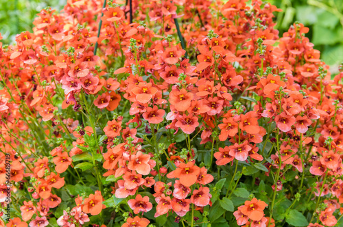 © zigzagmtart, Obraz premium Flowering hanging basket with peach colored blooms