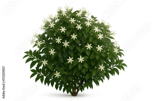 Fototapeta premium Flowering jasmine plant with white blossoms and lush green leaves, a...
