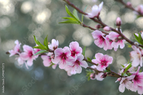 © youlia20, Obraz premium Flowering peach branch. Spring background.