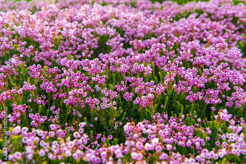 © be free, Naklejka premium Flowering plant. Flower blossom of nature background. Mountain heather blossom. Pink mountain heather meadow flower. Meadow with wildflower of mountain heather flower in nature. Summer nature