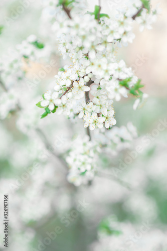 Fototapeta premium Flowering plum branches close-up on a warm spring morning.