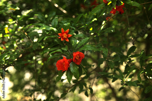 © ALYEVA, Obraz premium Flowering pomegranate tree. Pomegranate flowers and green leaves